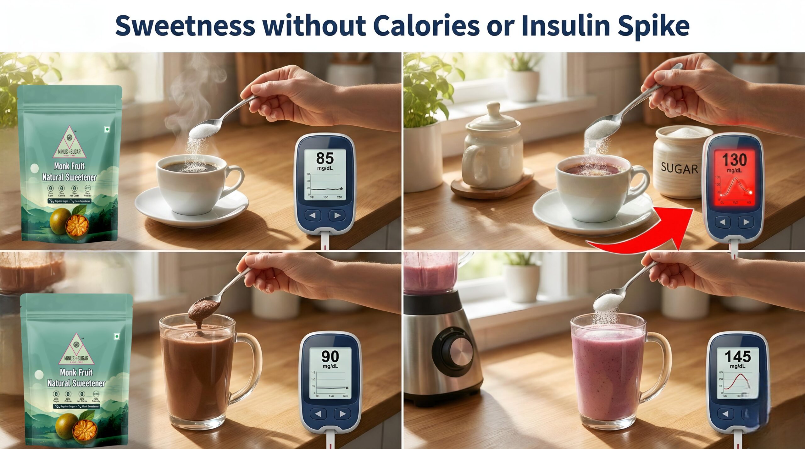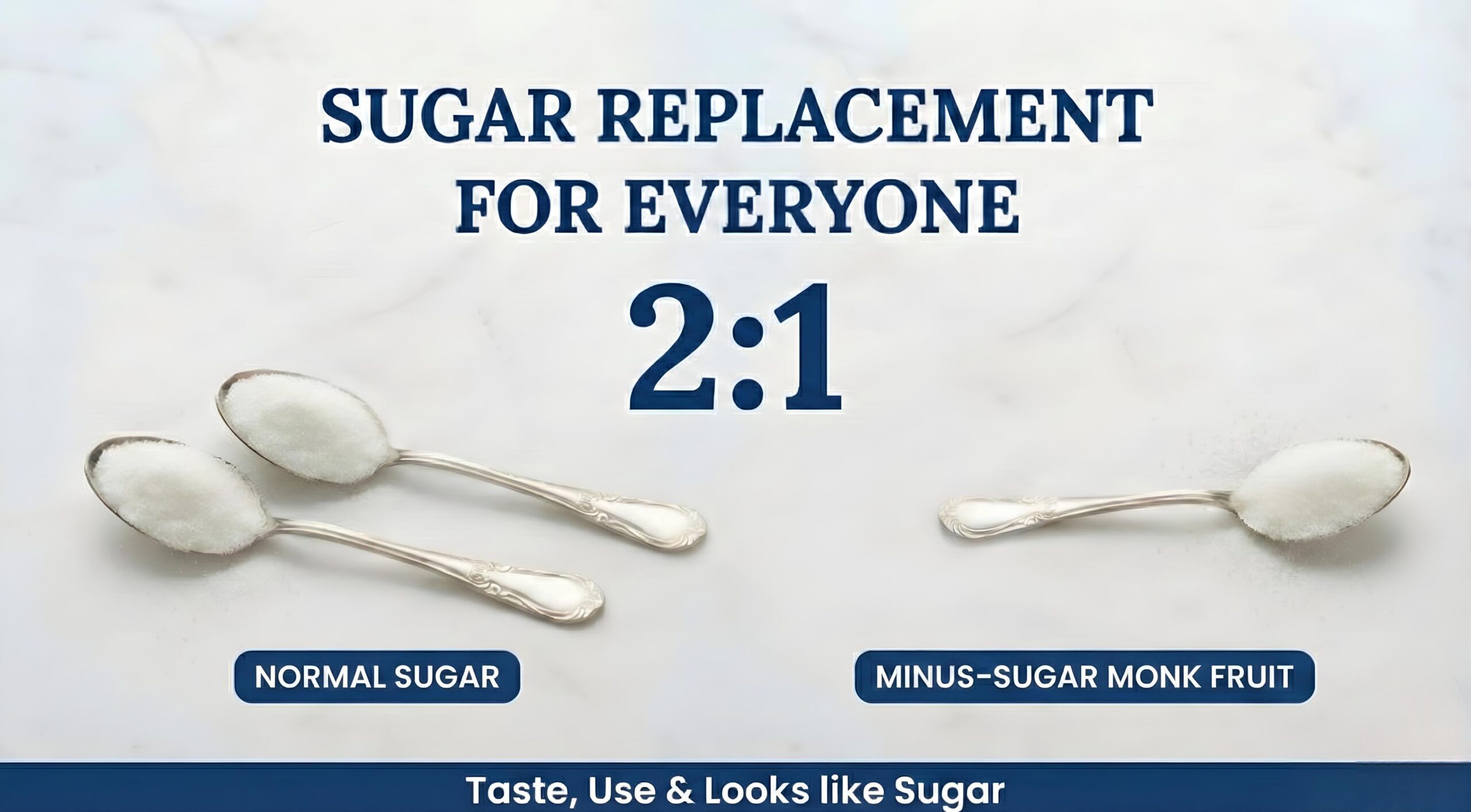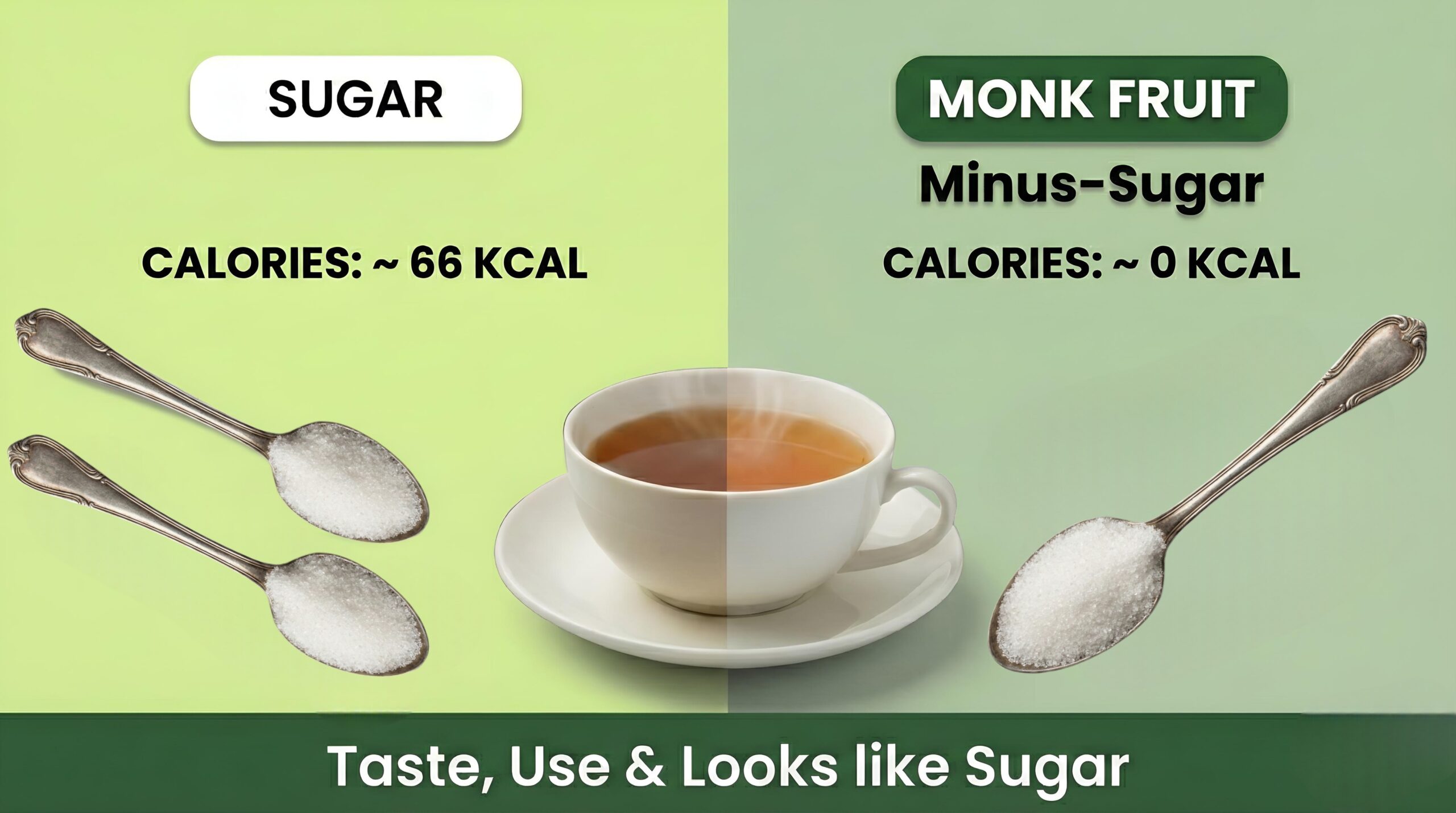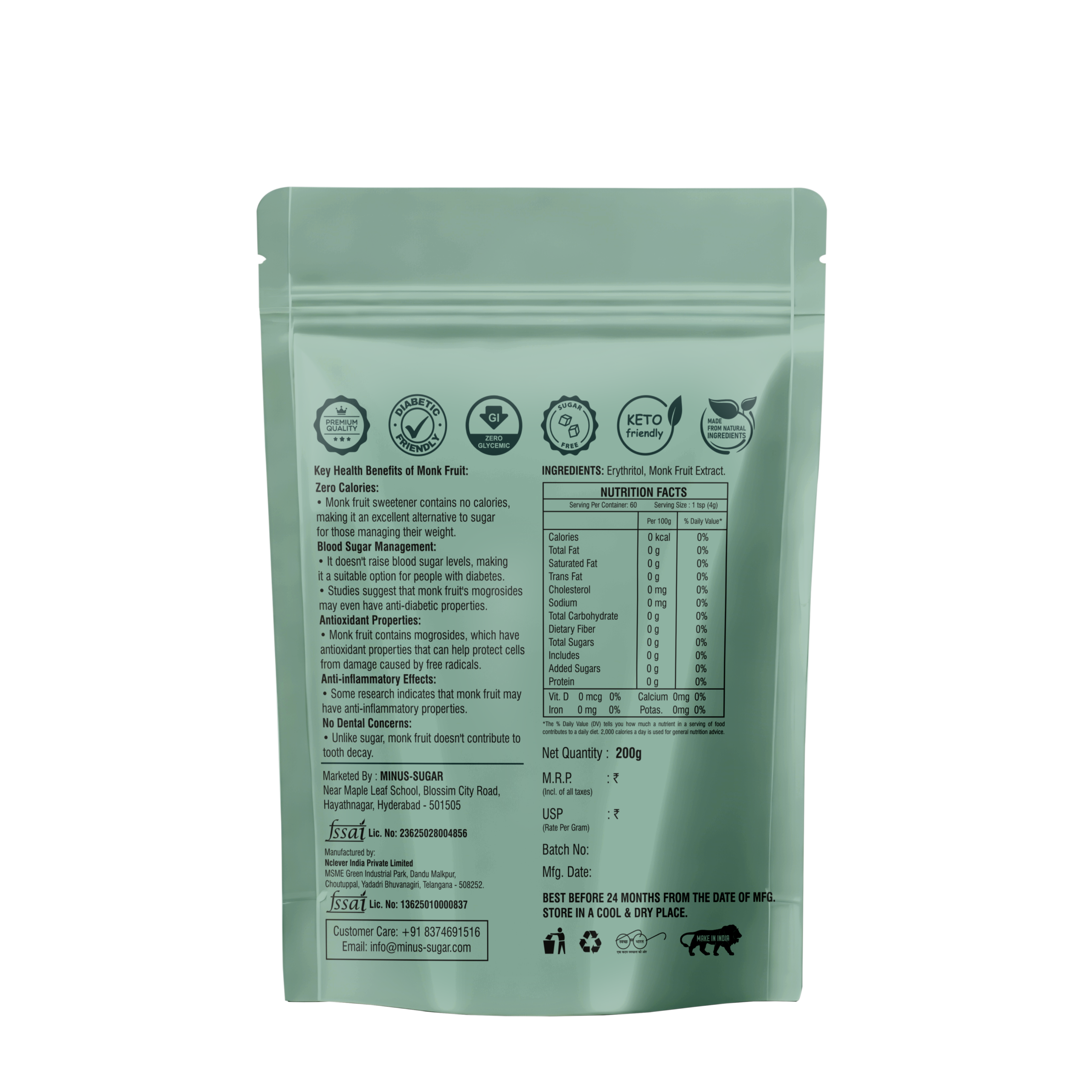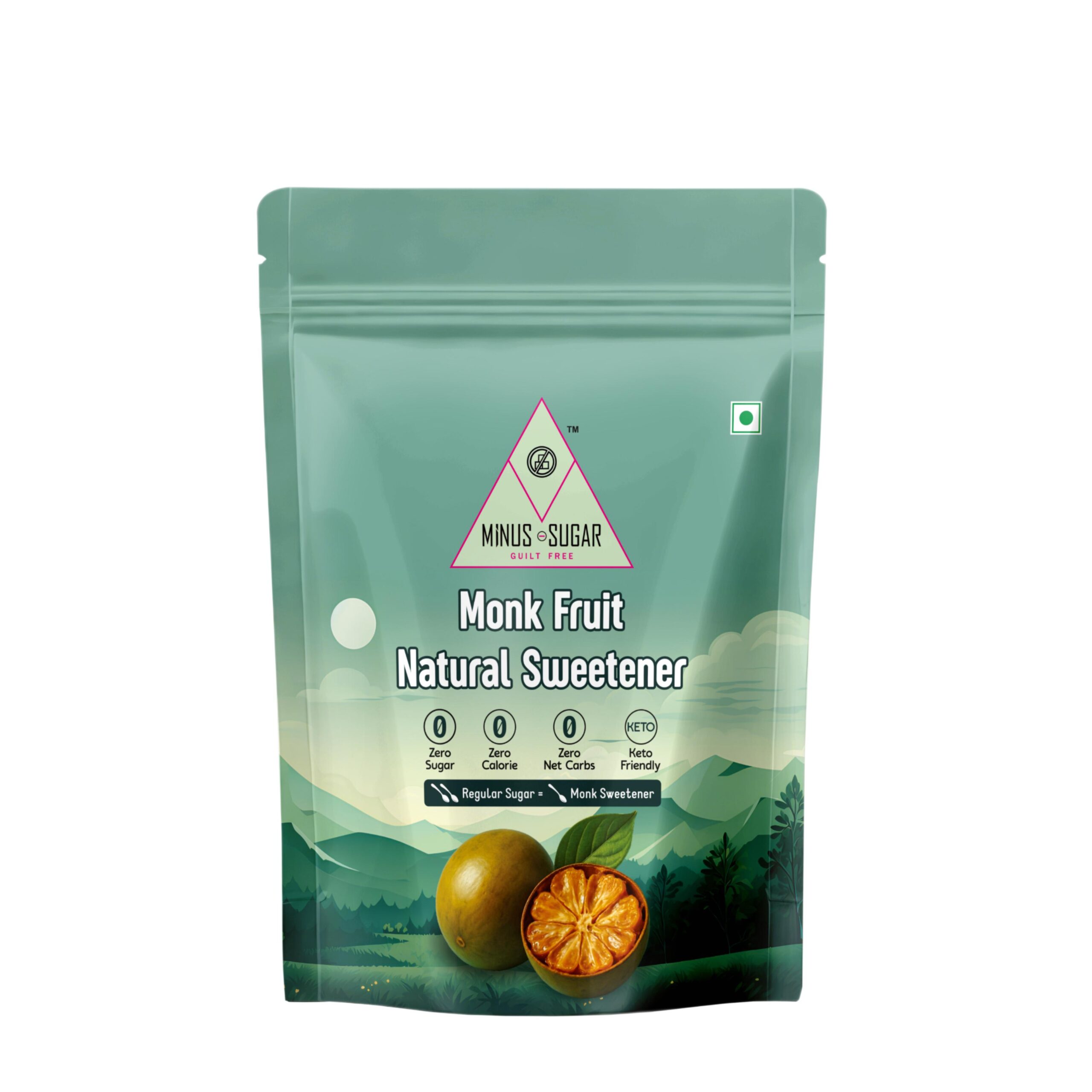 Enjoy sweetness without the guilt. Minus Sugar Monk Fruit Natural Sweetener is a plant-based, zero-calorie sugar alternative made from premium monk fruit extract. It delivers natural sweetness without affecting blood sugar levels, making it ideal for diabetics, keto followers, and health-conscious individuals.